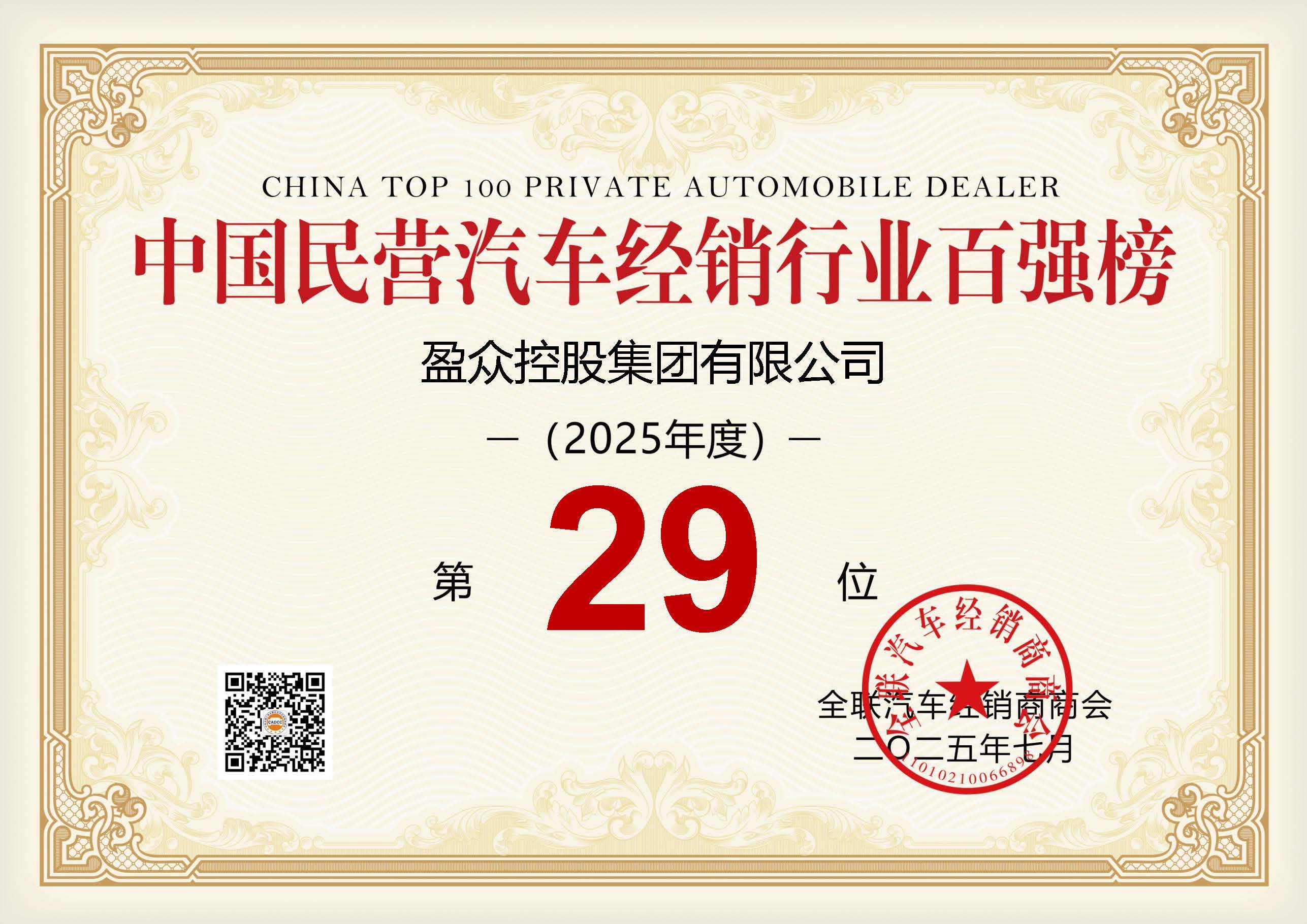 盈眾控股集團(tuán)憑借各項(xiàng)綜合實(shí)力,繼續(xù)入選“中國民營汽車流通行業(yè)百強(qiáng)榜”,位列第29位。