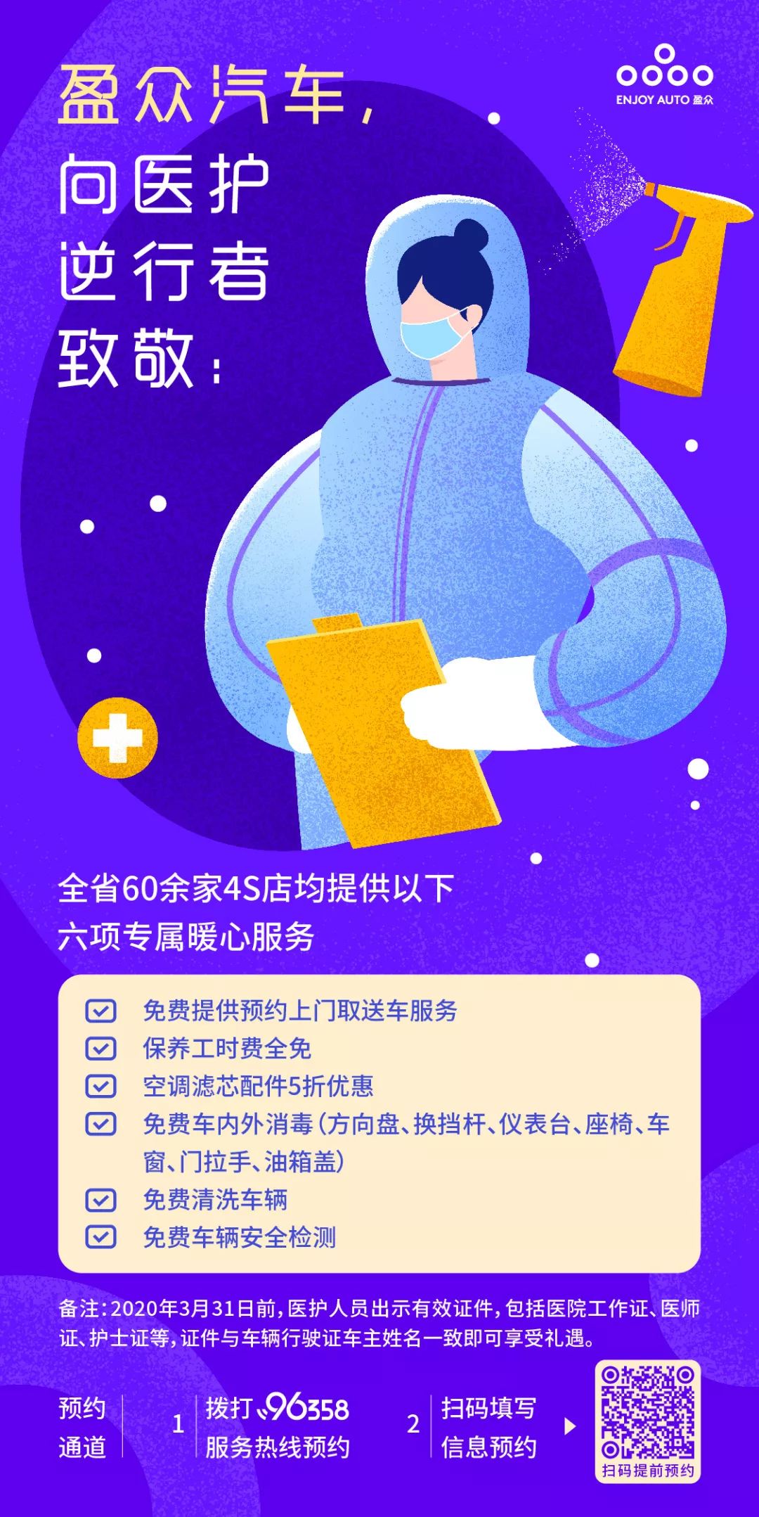 盈眾全省60余家4S店為醫(yī)護(hù)人員提供六項(xiàng)專屬暖心服務(wù),2020年3月31日前,醫(yī)護(hù)人員可通過以下兩種方式進(jìn)行預(yù)約——