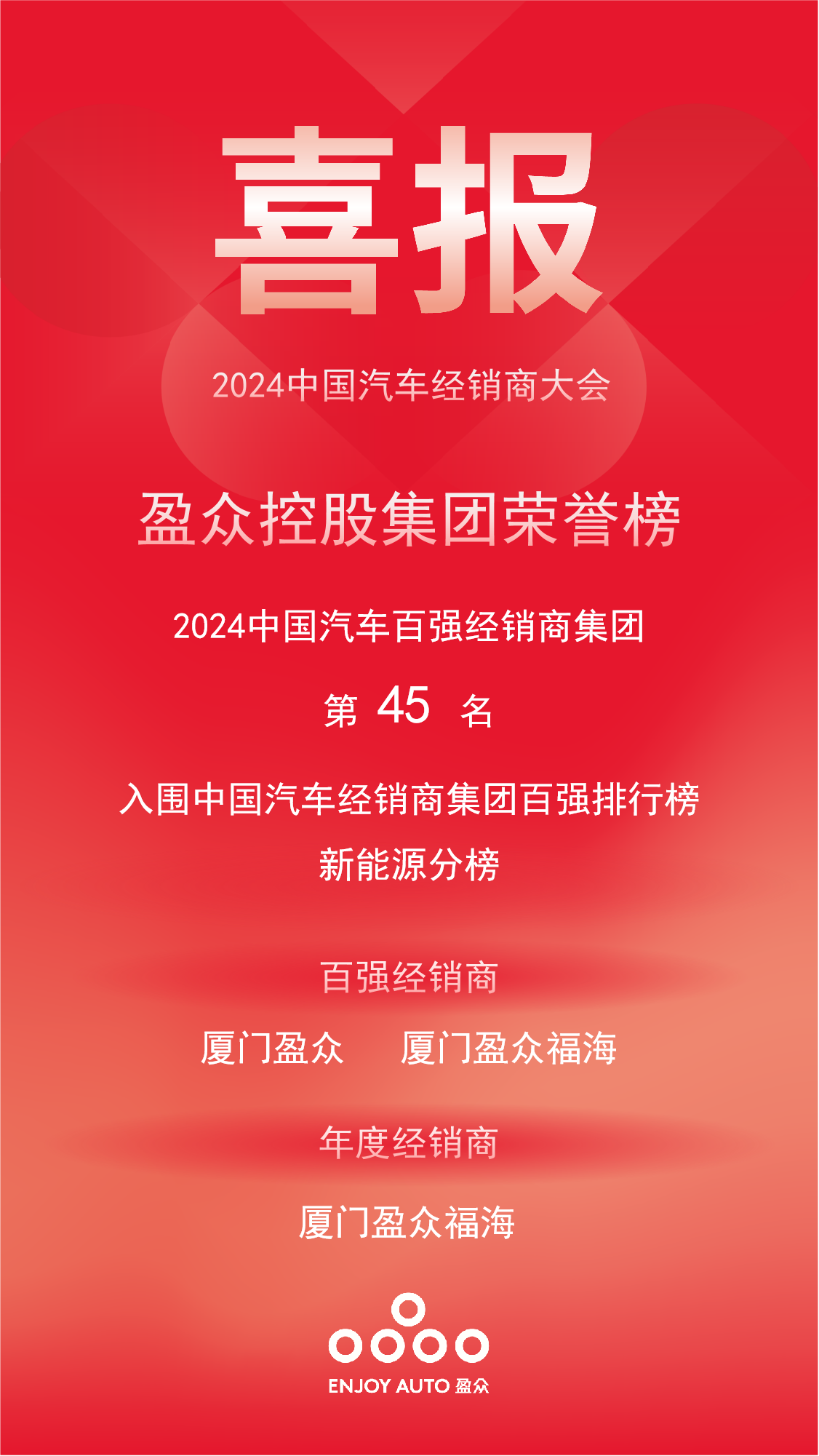 同時,盈眾控股集團(tuán)還入圍“2024中國汽車經(jīng)銷商集團(tuán)百強排行榜新能源分榜單”,旗下廈門盈眾及廈門盈眾福海榮獲“百強經(jīng)銷商”榮譽稱號,廈門盈眾福海入圍“年度經(jīng)銷商”。
